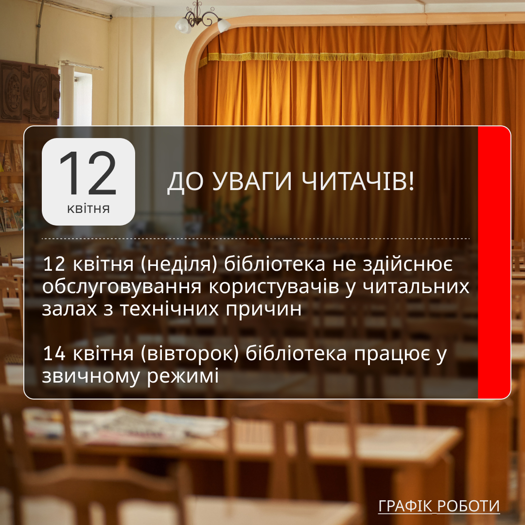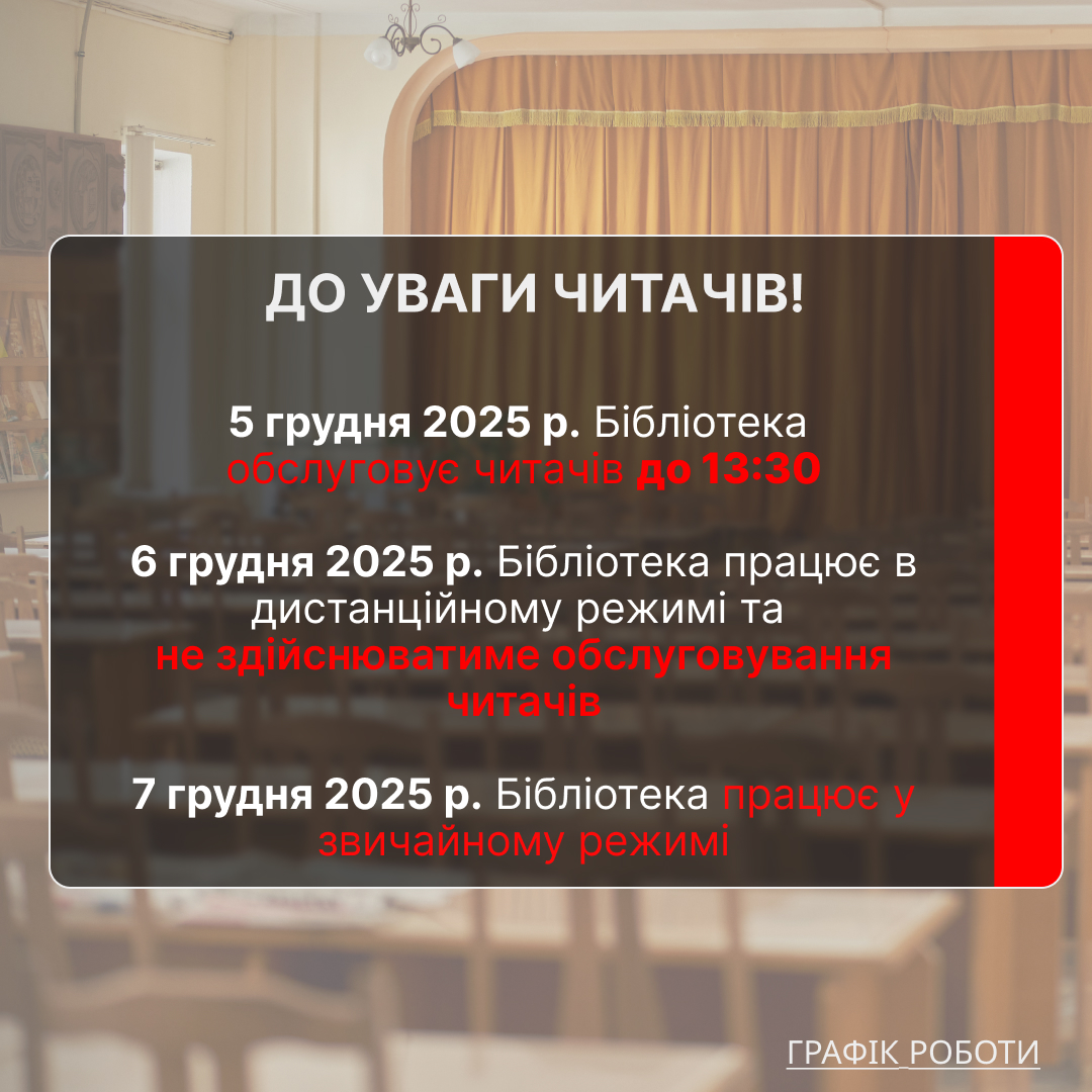 ⚠️ У разі оголошення повітряної тривоги в місті Києві обслуговування призупиняється. Усі читачі та працівники залишають приміщення Бібліотеки та прямують до найближчого укриття.