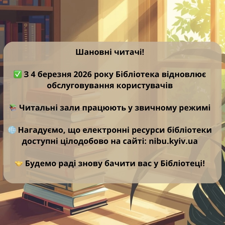⚠️ У разі оголошення повітряної тривоги у м. Києві обслуговування припиняється. Усі читачі та працівники полишають приміщення Бібліотеки та прямують до найближчого укриття.