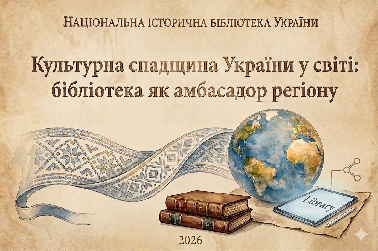 Упродовж 2026 року Національна історична бібліотека України проводить дослідження «Культурна спадщина України у світі: бібліотека як амбасадор регіону», що має на меті проаналізувати діяльність регіональних бібліотек України у сфері міжнародної співпраці та презентації історико-культурної спадщини свого краю в міжнародному культурному просторі за останнє десятиріччя. У межах дослідження передбачено вивчення: