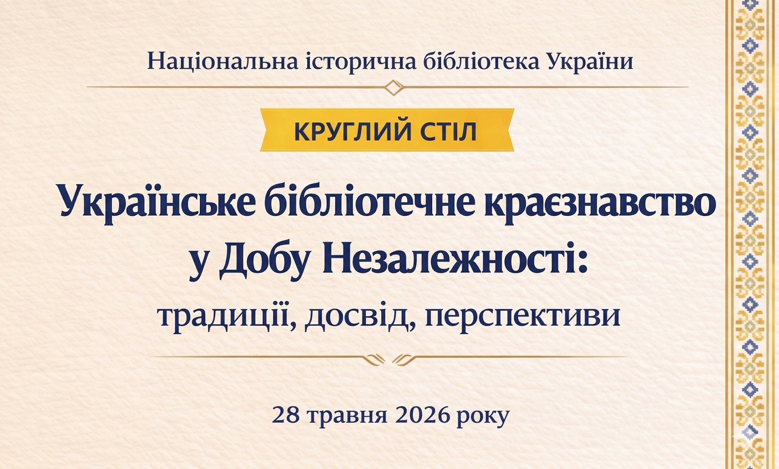 Національна історична бібліотека України запрошує 28 травня 2026 року взяти участь у Круглому столі «Українське бібліотечне краєзнавство у Добу Незалежності: традиції, досвід, перспективи», присвяченому 35-річчю проголошення Незалежності України та з нагоди Всеукраїнського дня краєзнавства. Термін подання заявок на участь у Круглому столі та повідомлень – до 15 травня 2026 р.