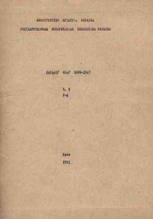 Каталог книг 1826-1917 гг. Ч. 1-3. - Київ, 1991. Ч.1. А-И. 168 с.; Ч.2. К-п. 184 с.; Ч.3. Р-Я. 162 с. |