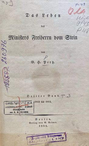 Pertz, Georg Heinrich. Das Leben des Ministers Freiherrn vom Stein. Bd. 3: 1812-1814. Berlin, 1851. 726 S. (Шифр 9(431)/P48-656911)