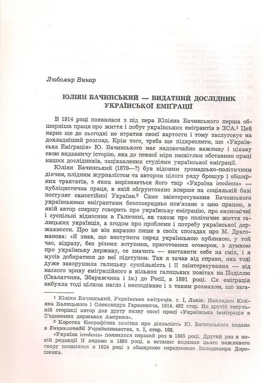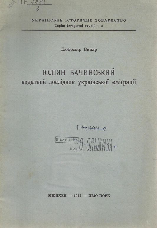 Винар, Любомир. Юліян Бачинський видатний дослідник української еміграції / Л. Винар. – Мюнхен; Нью-Йорк, 1971. – 16 с.