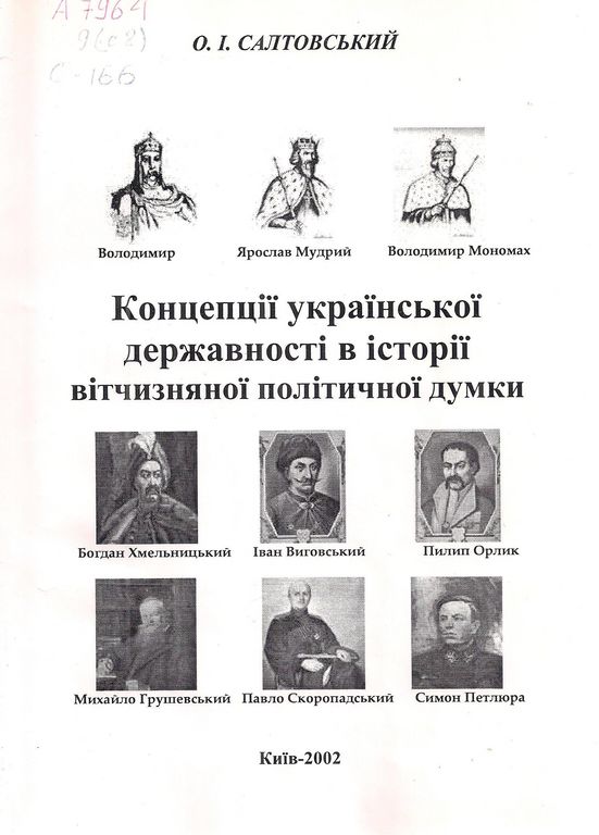 Салтовський, О. І. Концепції української державності в історії вітчизняної політичної думки (від витоків до початку ХХ сторіччя) / О. І. Салтовський ; Київський національний університет імені Т. Шевченка. – Київ : ПАРАПАН, 2002. – 396 с.