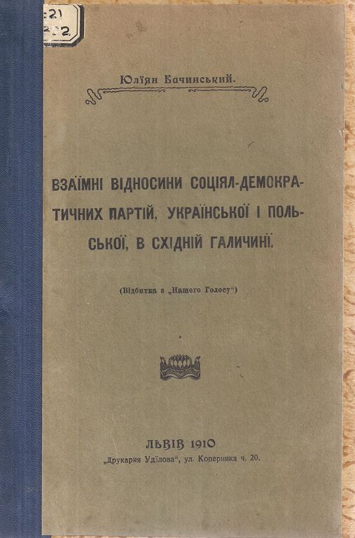 Бачинський, Юліан. Взаїмні відносини соціял-демократичних партій, української і польської, в східній Галичині : (Відбитка з "Нашого голосу") / Ю. Бачинський. – Львів : Друкарня Уділова, 1910. – 31 с.