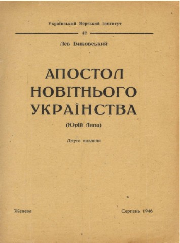 Биковський Лев. Апостол новітнього українства (Юрій Липа) / Л. Биковський. – 2. вид. – Женева : [б.в.], 1946. – 8 c. – (Український морський інститут ; 42)