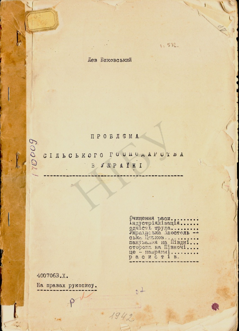 Биковський Лев. Великодержавні проблеми України / Л. Биковський ; Український Океанічний Інститут (Ч. 1). – Київ, 1942. – 24 с.: іл. (відбитка з «Чорноморського збірника», книга 1 ; Видання Українського Чорноморського інституту, Ч. 10.)