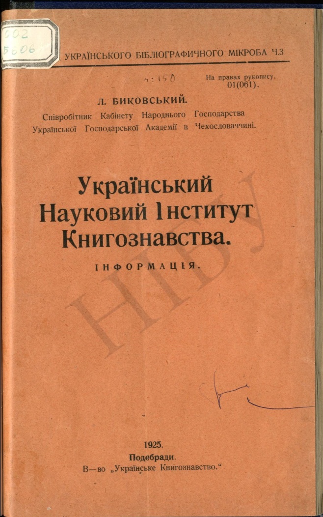 Биковський Лев. Український науковий інститут книгознавства: інформація / Л. Ю. Биковський. – Подєбради : В-во Укр. книгознавство, 1925. – 47 с. – (Книгозбірня українського бібліографічного мікроба ; Ч. 3). – На правах рукописи.