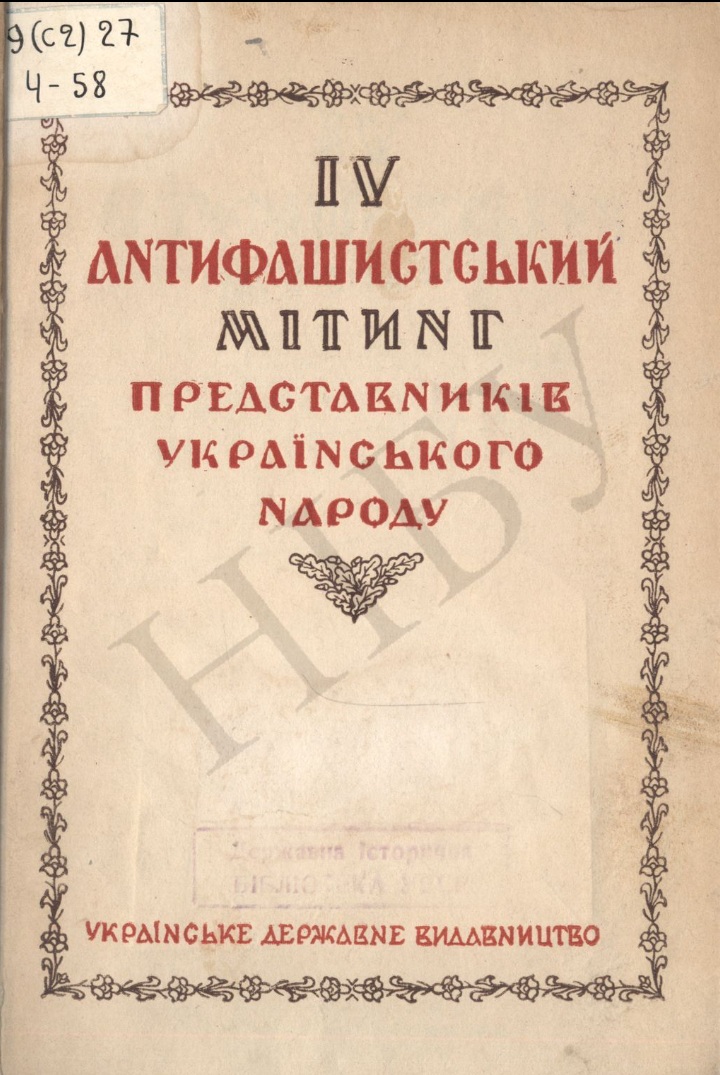 IV антифашистський мітинг представників українського народу / відп. за вип. М. Ляхович. – Київ : Українське державне видавництво, 1944. – 39 с.