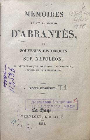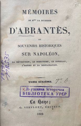 Abrantes, d' (madame la duchesse). Memoires... ou Souvenirs historiques sur Napoleon, la Revolution; le Directoire, le Consulat, l'Empire et la Restauration [Текст] . Vol. 6 / d' Abrantes ; ed. G. Vervloet. - [S. l. : s. n.], 1832. - 370 p.
