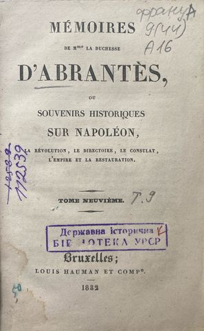 Abrantes, d'. Memoires de M-me la duchesse (d'Ambrantes), ou souvenirs historiques sur Napoleon, la Revolution... [Текст] . T. 9 / Abrantes, d'. - Bruxelles : L. Haumann et C-ie, 1832. - 345 p.
