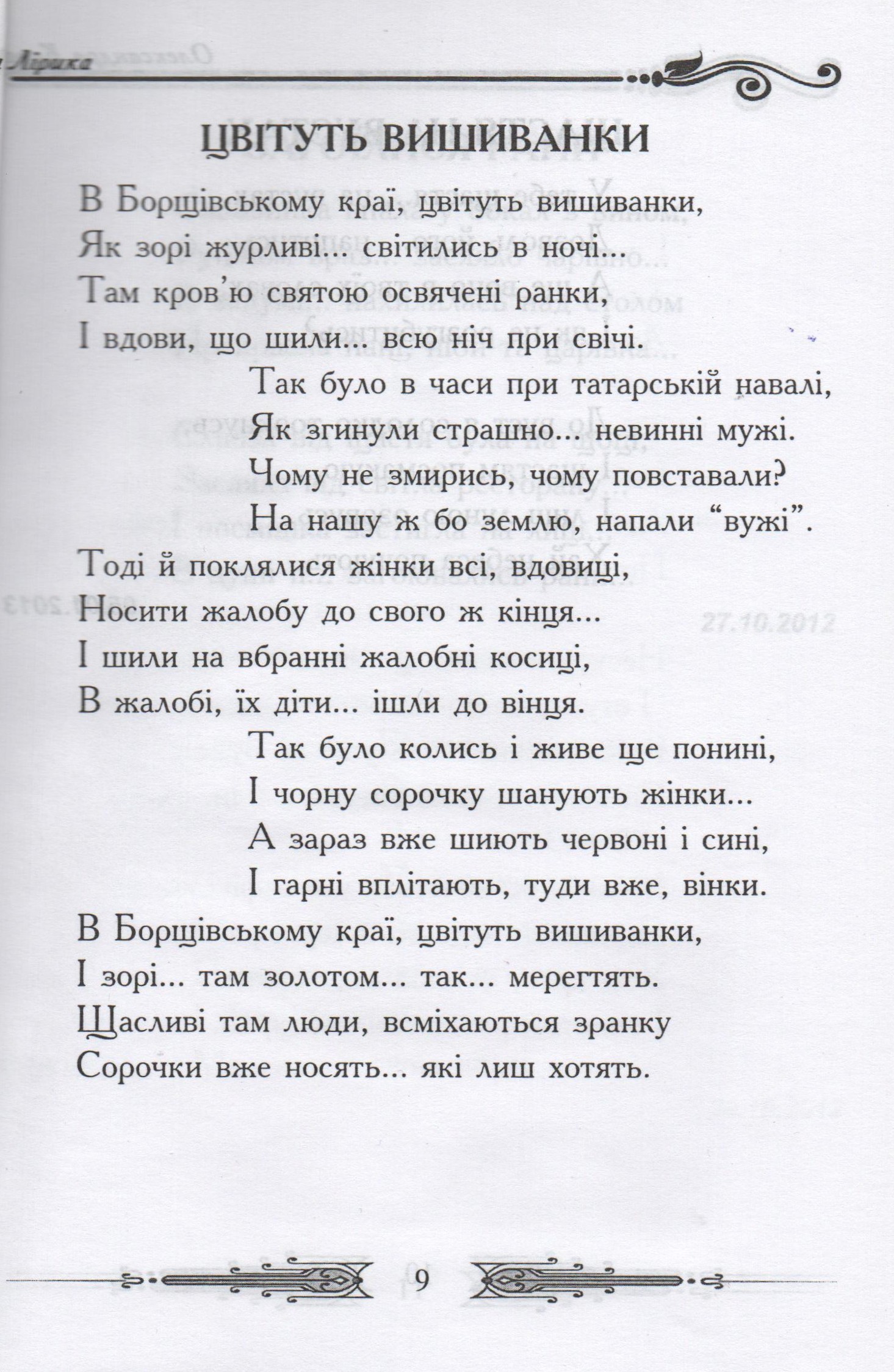 Поетеса Олександра Кара мала нагоду з дитинства любуватися розмаїтою красою борщівських сорочок, такій давній і самобутній вишивці вона присвятила вірші, в яких передала любов до вишивки, вміння побачити в ній духовний стрижень народу, творчий зв’язок поколінь [Кара О. Ю. Сила Борщівської сорочки, 2013. – С. 9].