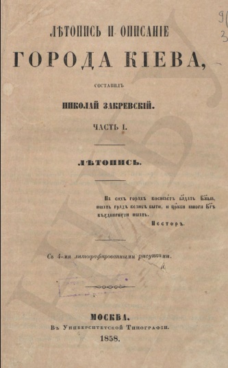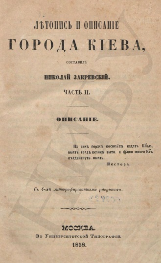Летопись и описание города Киева : [в 2 ч.] / сост. Николай Закревский. – Москва : В Университетской типографии, 1858.