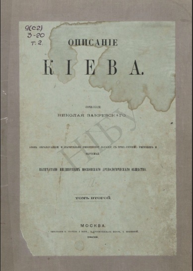 Описание Киева: сочинения: вновь обработанное и значительно умноженное издание с приложением рисунков и чертежей Т. 1. – Т. 2 / Н. Закревский. – Москва : Тип. В. Грачева и Комп., 1868. – 940 с. : ил. – [Друк. екслібрис]: «Изъ библиотеки В. И. Гошкевича»