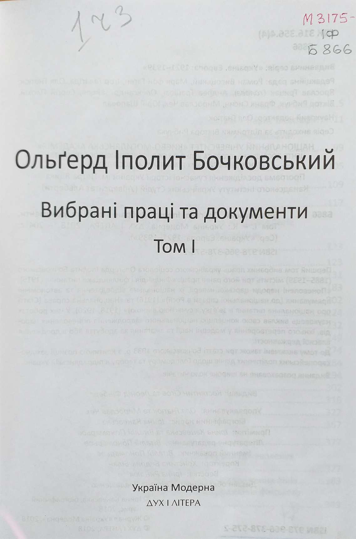 3. Бочковський, Ольґерд Іполит. Вибрані праці та документи. Т. 1 / О. І. Бочковський. – Київ : ДУХ І ЛІТЕРА : Україна Модерна, 2018. – 703 с. : 8 вкл. л. – (Україна. Європа: 1921–1939).