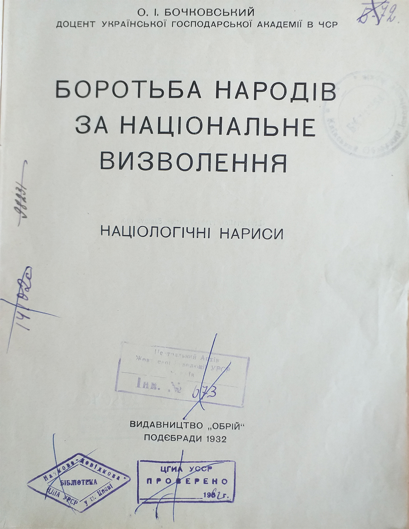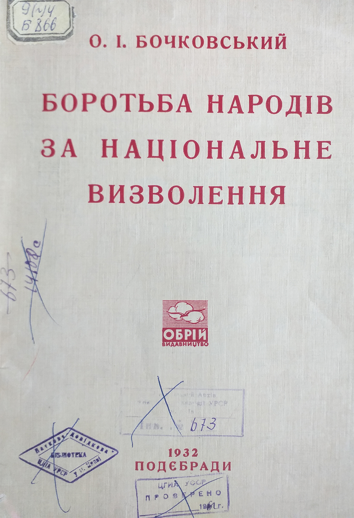 Бочковський, О. І. Боротьба народів за національне визволення : націологічні нариси / О. І. Бочковський. – Подєбради : Обрій, 1932. – 256 с. : карти. – Відбитки печаток: 1. «ЦГИА УССР. Проверено 19/рукоп. / 62». 2. ЦДІА УРСР у м. Києві. Науково-довідкова бібліотека». 3. «Київський обласний державний архів. Бібліотека» «Центральний архів Жовтневої революції УРСР. м. Київ. Інв.№ /рукоп. 673/».