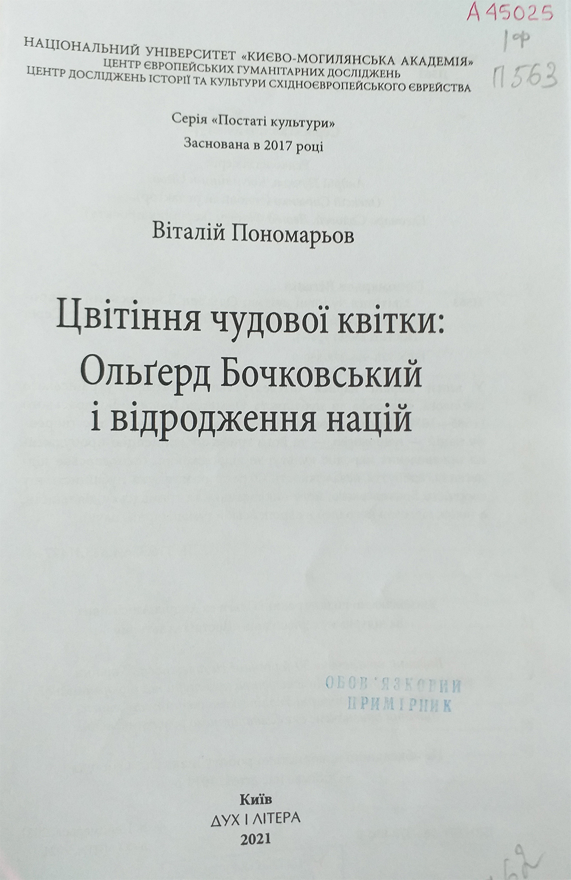 2. Пономарьов, Віталій. Цвітіння чудової квітки: Ольґерд Бочковський і відродження націй / В. Пономарьов ; Нац. ун-т «Києво-Могилянська академія», Центр досліджень історії та культури Східноєвропейського єврейства, Центр європейських гуманітарних досліджень. – Вид. 2-ге. – Київ : ДУХ І ЛІТЕРА, 2021. – 183 с. – (Постаті культури).