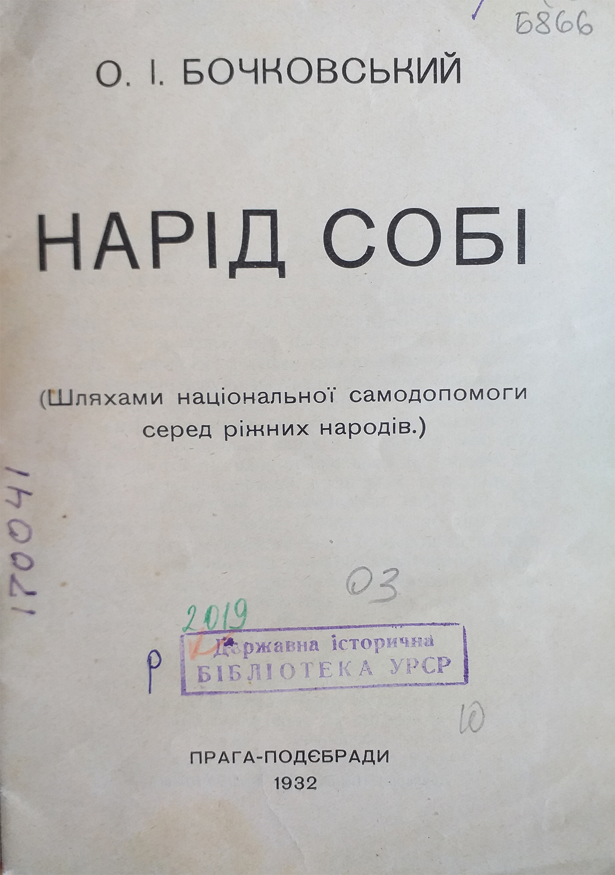 Бочковський, О. І. Нарід собі : (шляхами національної самодопомоги серед ріжних народів) / О. Бочковський ; Товариство Прихильників Української Господарської Академії. – Прага ; Подєбради : Legiografie, 1932. – 44 с.