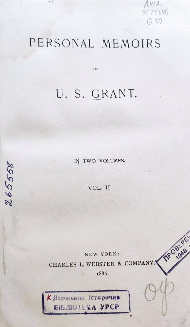 Grant, U. S. Personal memoirs (in two volumes) [Текст] . Т. 2 / U. S. Grant. - New York : Webster, 1886. - 647 p.