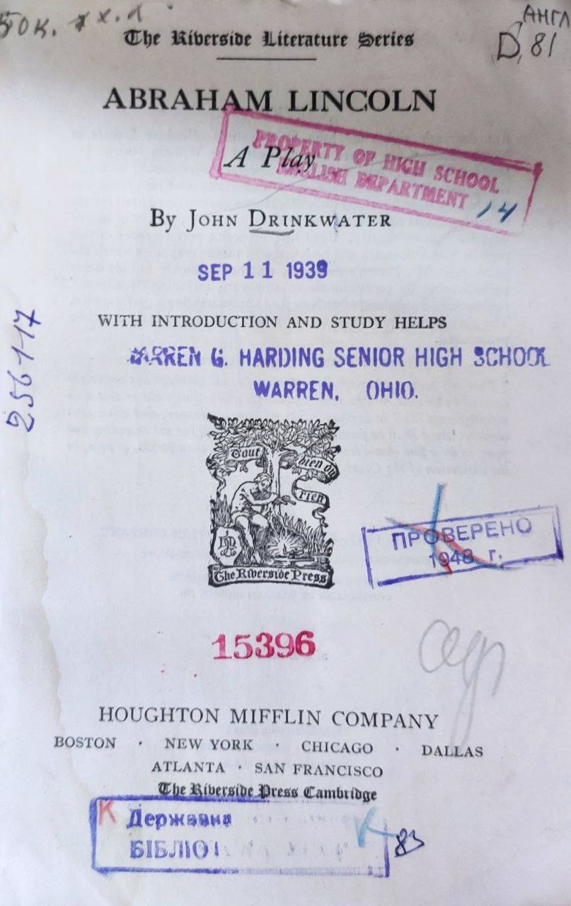 Drinkwater, John. Abraham Lincoln. A Play. With Intr. and Study Helps [Текст] / J. Drinkwater. - Boston ; New York ; Chicago etc. : Houghton Mifflin Company, The Riverside Press, Cambridge, w.y. - 130 p.