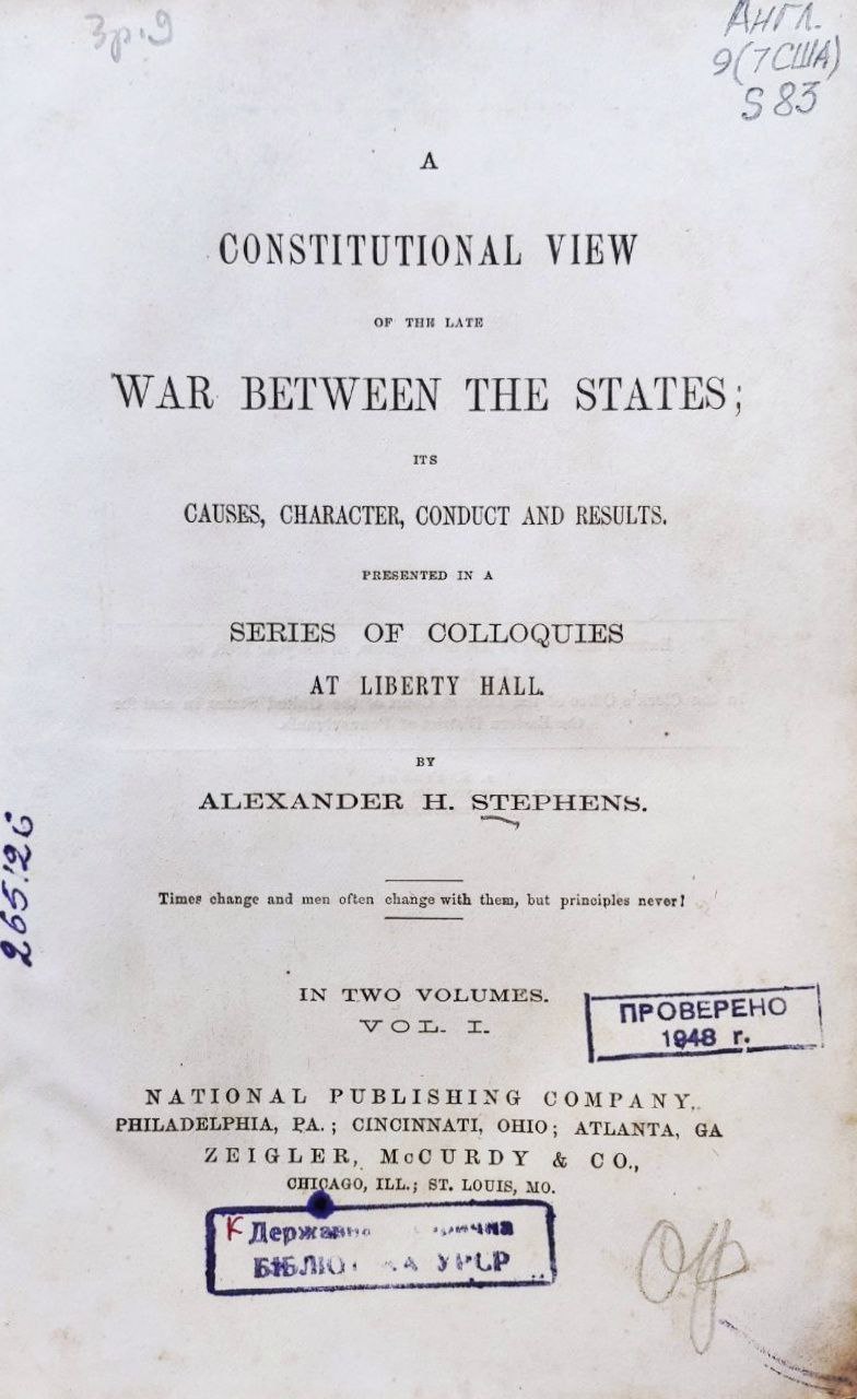 Stephens, Alexander H. A constitutional view of the late war between the states; its causes, character, conduct and results [Текст] . In 2 vol. Vol. I / A. H. Stephens. - Philadelphia; Cincinnati; Ohio: Zeigler, McCurdy, 1868. - 654 p.