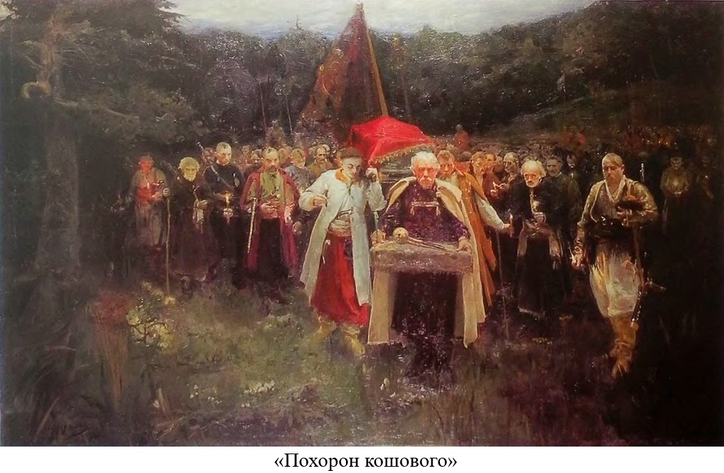 Під керівництвом Іллі Рєпіна художник створює своє перше фундаментальне полотно – дипломну роботу «Похорон кошового». Картина була визнана кращою серед студентських робіт, за що художник отримав золоту медаль і відрядження з перспективою продовження освіти у кращих живописців Німеччини, Італії та Франції. Козацька тематика була однією з улюблених І. Рєпіна, що і вплинуло на вибір сюжету. Існує припущення, що позував для картини Михайло Старицький.