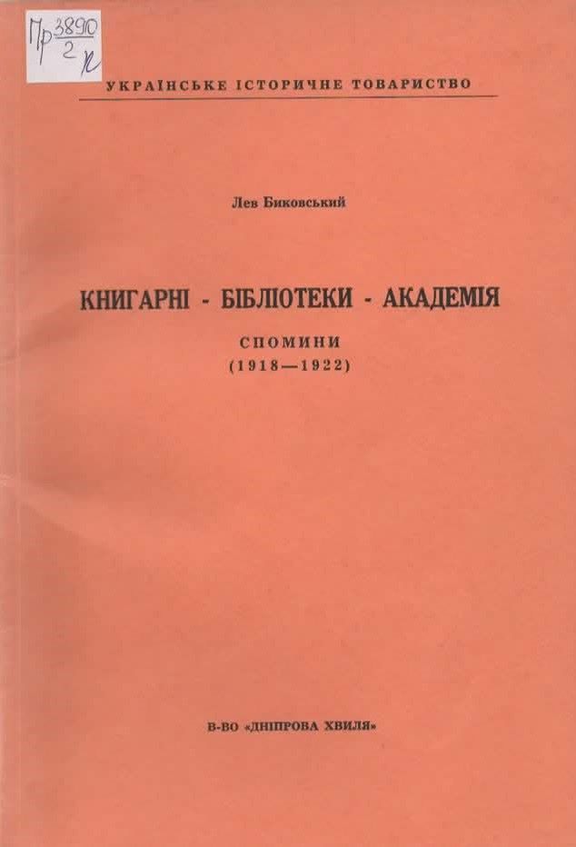 7. Биковський Л. Книгарні – бібліотеки – академія : спомини : (1918–1922) / Л. Биковський ; літ. ред. К. Туркало. – Мюнхен ; Денвер : Дніпрова хвиля, 1971. – 152, [1] с. : фот. – (Українське іст. т-во). Шифр:Пр3890/2