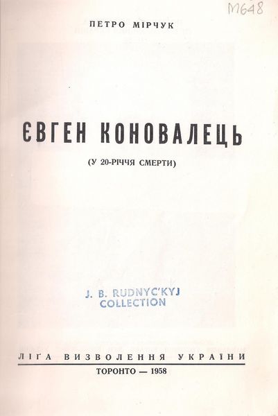 Мірчук, П. Євген Коновалець : (у 20-річчя смерти) / П. Мірчук. – Торонто : Ліга визволення України, 1958. – 108 с. : іл. – (Політична бібліотека Ліги визволення України ; ч. 14).