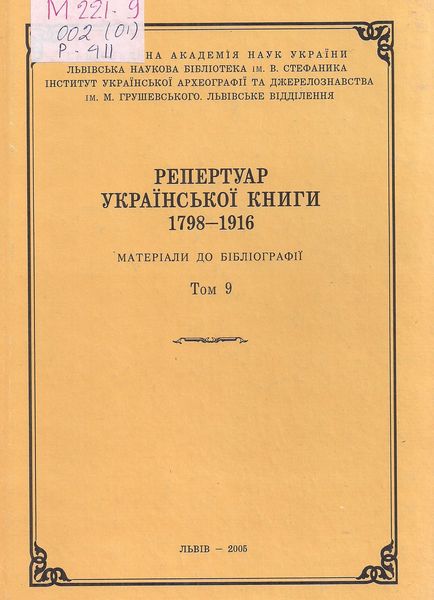 Репертуар української книги 1798–1916 : матеріали до бібліографії. Т. 9 : 1914–1916 / Національна академія наук України, Інститут української археографії та джерелознавства ім. М. С. Грушевського, Львівська національна наукова бібліотека України ім. В. Стефаника ; упоряд. Л. І. Ільницька. – Львів, 2005. – 244 с.