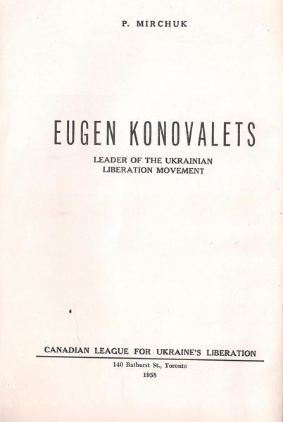 Мірчук, П. Євген Коновалець : (у 20-річчя смерти) / П. Мірчук. – Торонто : Ліга визволення України, 1958. – 108 с. : іл. – (Політична бібліотека Ліги визволення України ; ч. 14).