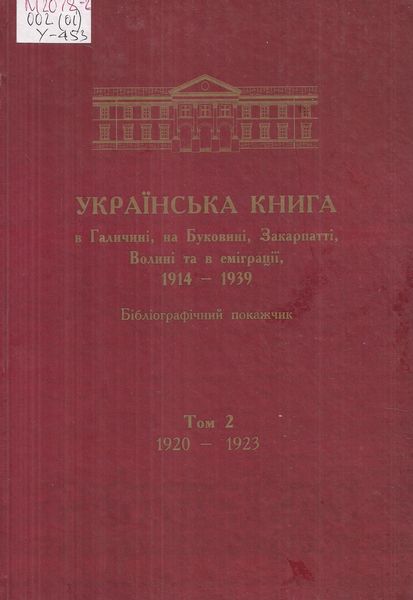 Українська книга в Галичині, на Буковині, Закарпатті, Волині та еміграції, 1914-1939 : бібліогр. покажчик. Т.2 : 1920-1923. – Львів, 2012. – 804 с.