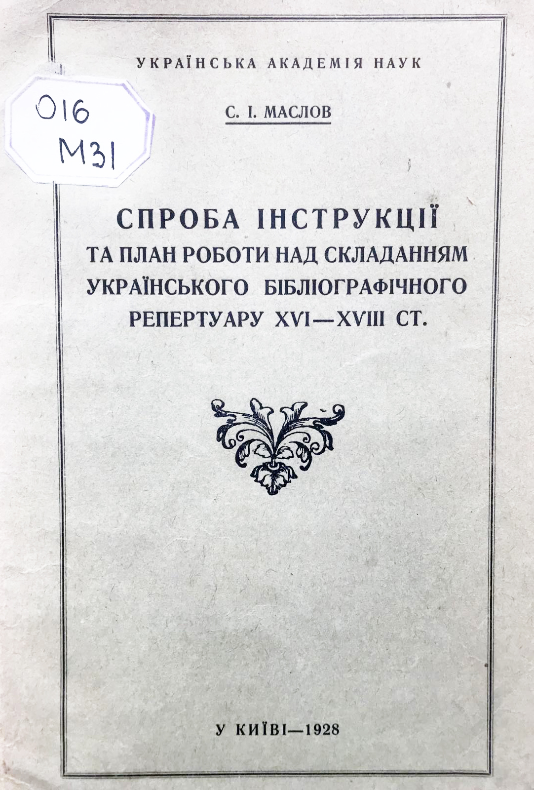 Маслов С. І. Визначення дублетів в ділянці стародруків. – Київ, 1936. – 13 с. / С. І. Маслов ; Бібліотека Академії наук УСРР. – (Матеріали до історії книги і письма).