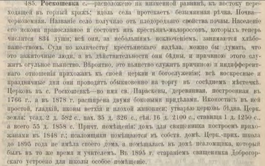 стического комитета. Выпуск девятый: Приходы и церкви Подольской епархии» (1901 р.) подається інформація про дерев'яну церкву у с. Роскошівці на ім'я святої Параскеви, побудованої у 1766 р., яка в 1878 р. була розширена двома бічними приділами.