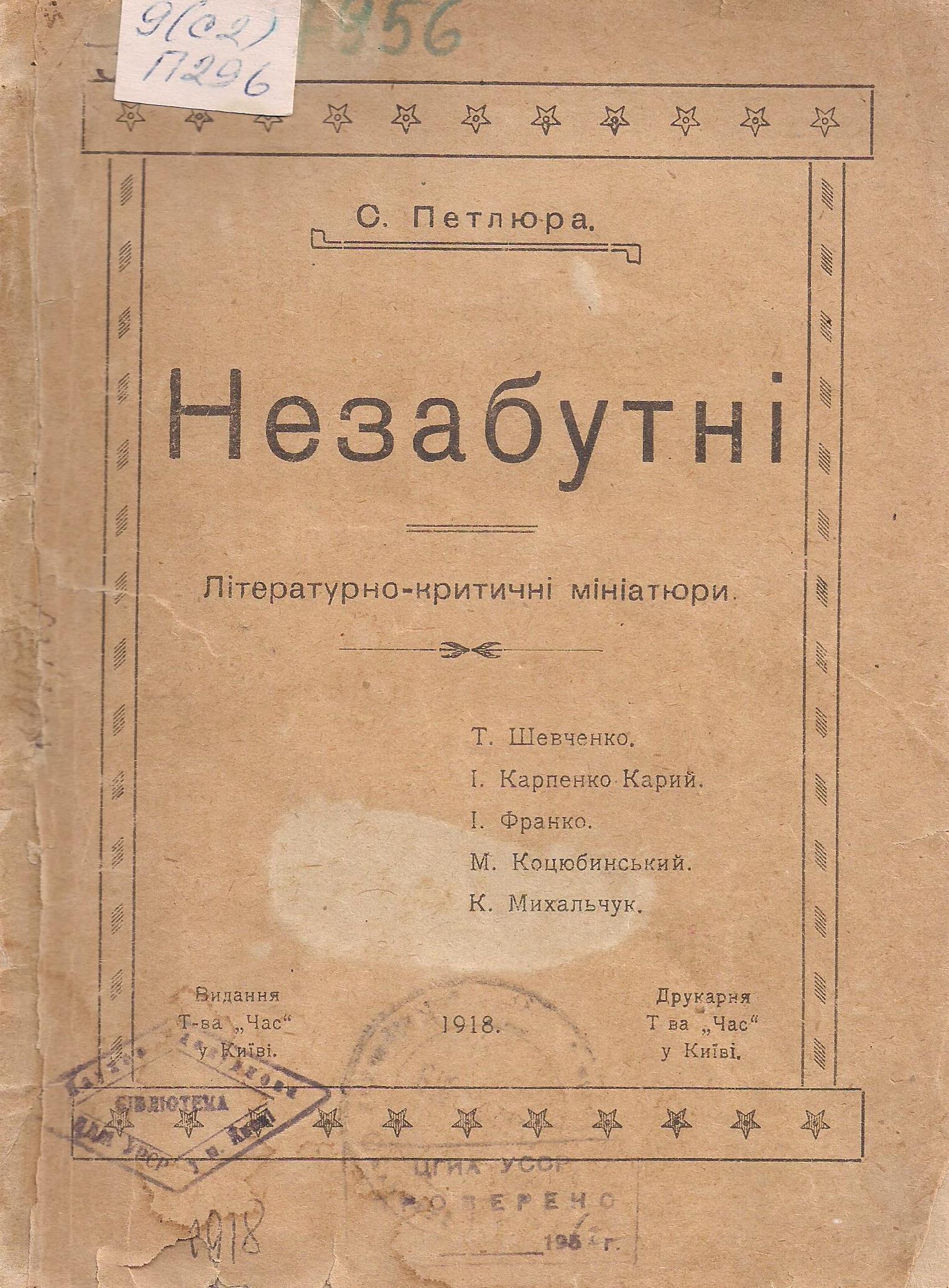 Петлюра, С. В. Незабутні : літературно-критичні мініатюри / С. В. Петлюра. – Київ : Друк. Т-ва "Час", 1918. – 80 с. – Зміст: Т. Шевченко, І. Карпенко-Карий, І. Франко, М. Коцюбинський, К. Михальчук.