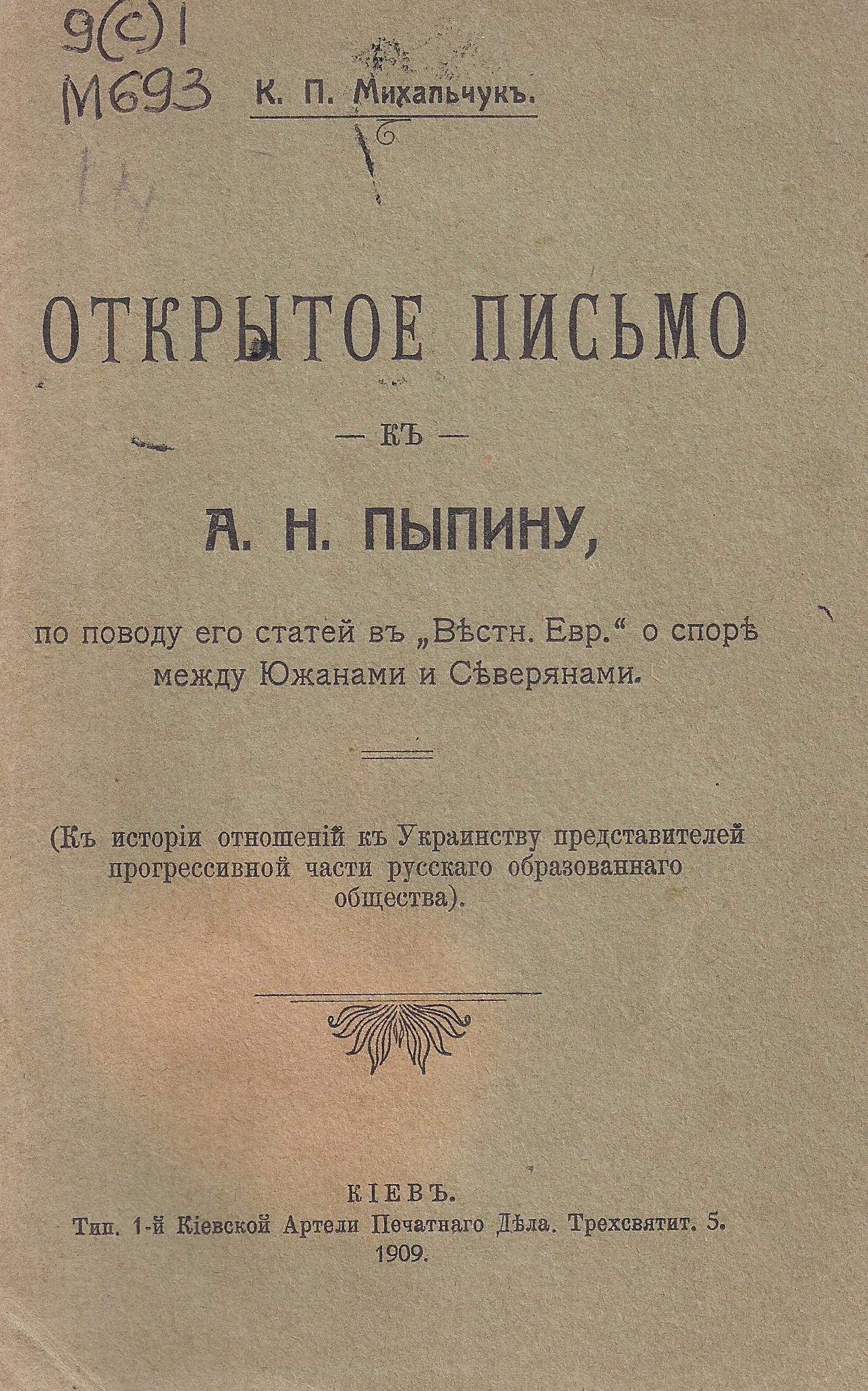 Михальчук, К. П. Открытое письмо к А. Н. Пыпину, по поводу его статей в “Вестник Европы” о споре между южанами и северянами : (к истории отношений к украинству представителей прогрессивной части русского образовательного общества) / К. П. Михальчук. – Киев : Типография 1-й Киевской Артели Печатного Дела, 1909. – 163 с.