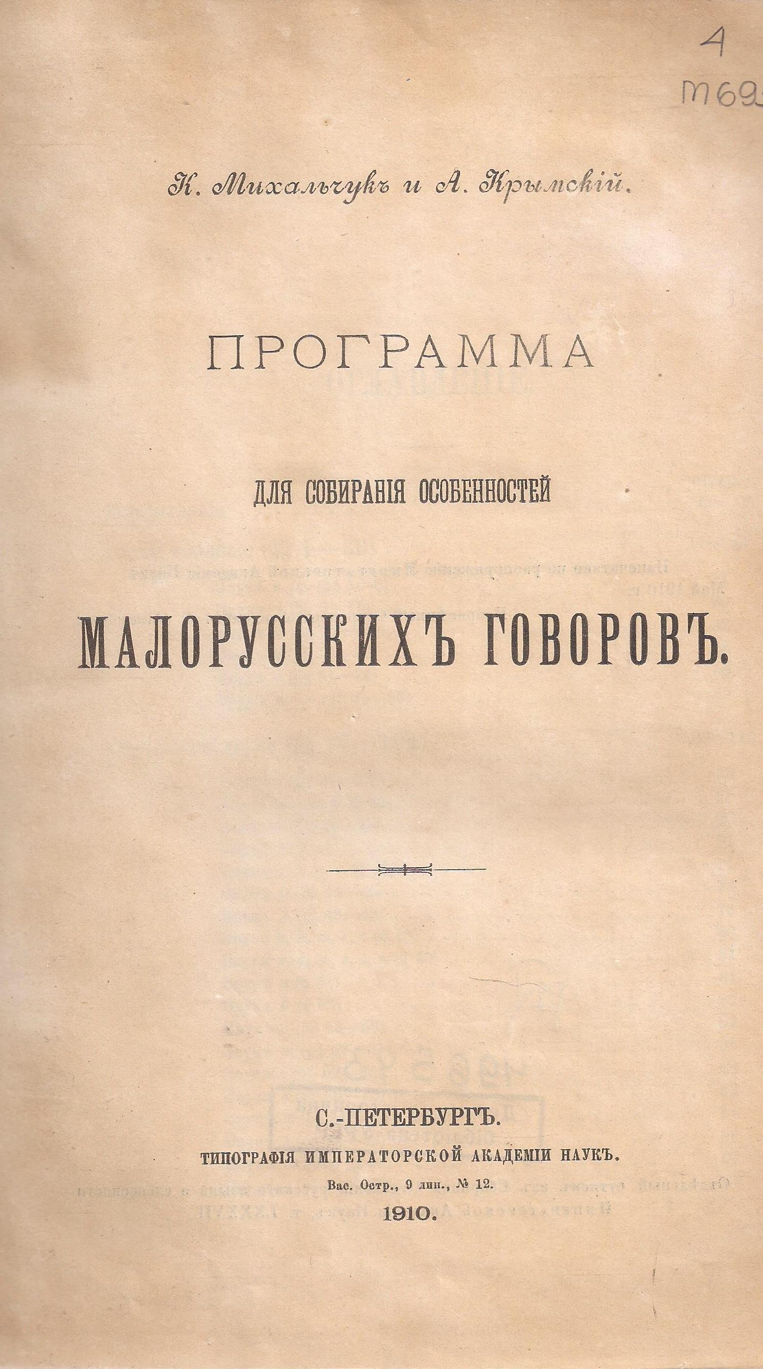 Михальчук, К. П. Программа для собирания особенностей малорусских говоров / К. П. Михальчук, А. Е. Крымский. – Санкт-Петербург : Типография Императорской Академии наук, 1910. – 163 с.