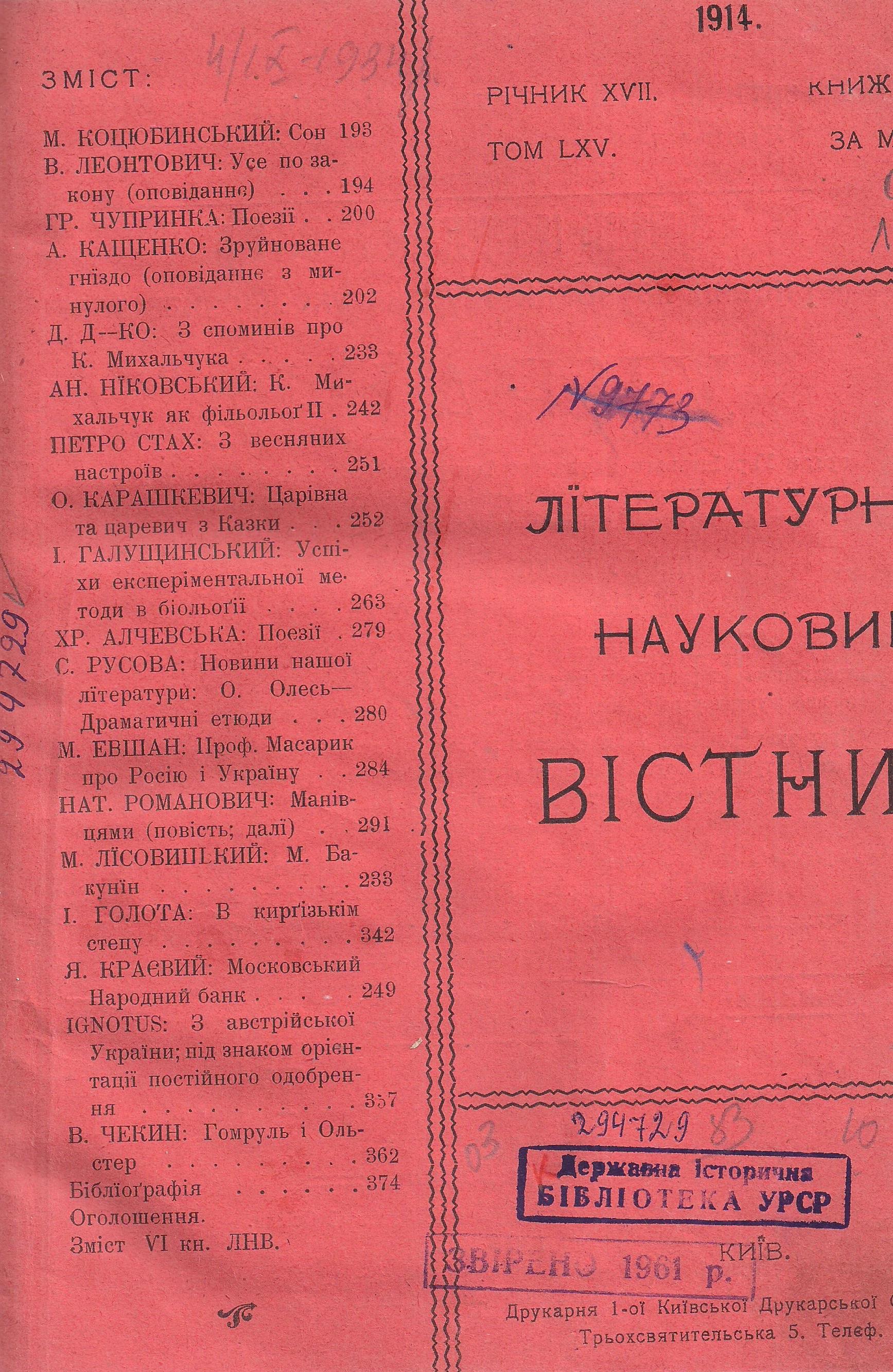 Михальчук, К. П. К ответам кн. Е. Н. Трубецкого на анкету «Украинской жизни» / К. П. Михальчук // Украинская жизнь. – 1914. – № 11-12. – С. 18-31. – Відбиток печатки: «Т-во «ЧАС» у КИЇВІ. КНИГОЗБІРНЯ. Володимирська, 42».