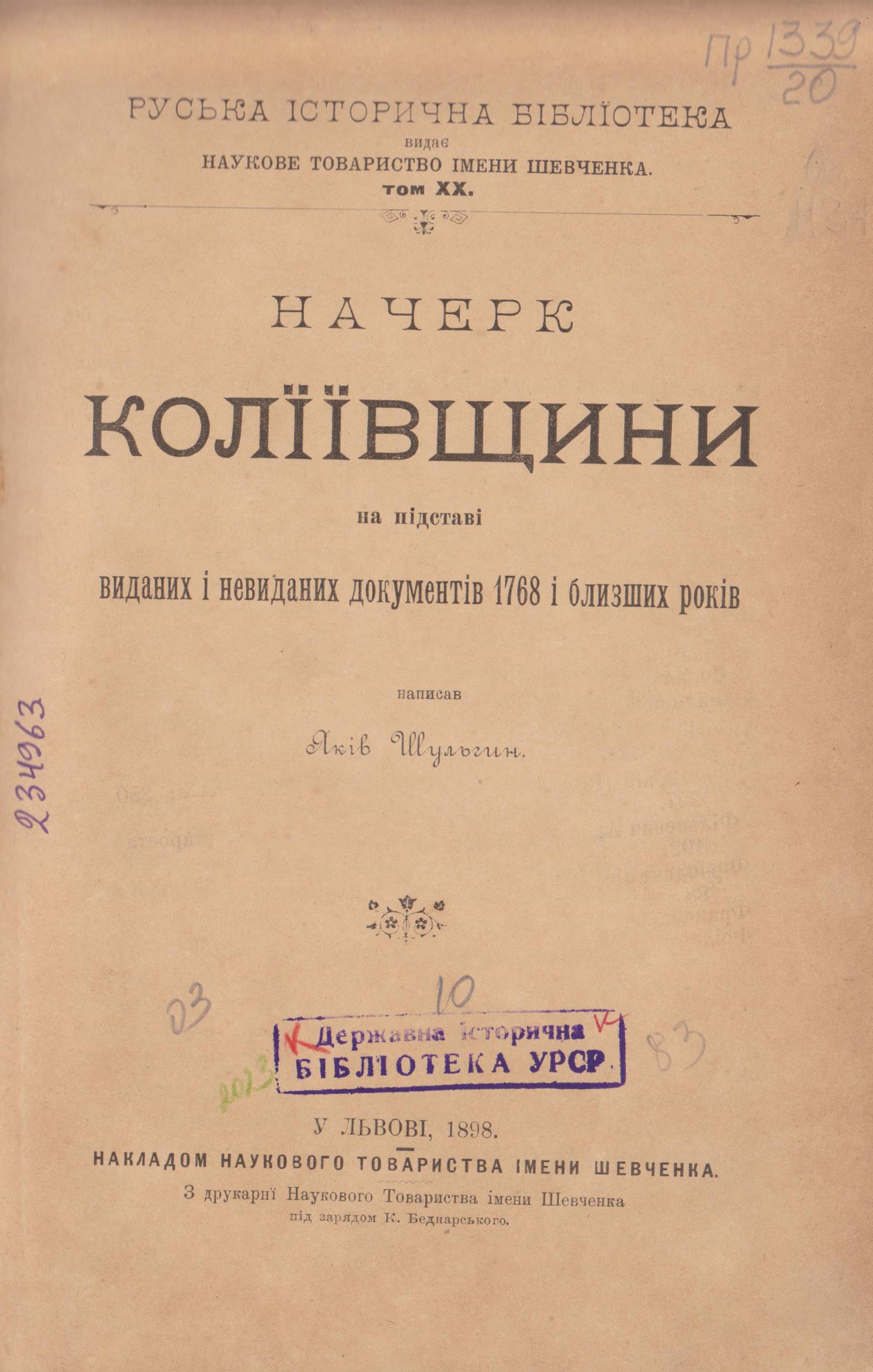 Шульгин, Яків Миколайович. Начерк Коліївщини на підставі виданих і невиданих документів 1768 і ближчих років / Я. Шульгин. – Львів : З друкарні НТШ під зарядом К. Беднарського, 1898. – IV, 219 c. – (Руська історична бібліотека ; т. 20).