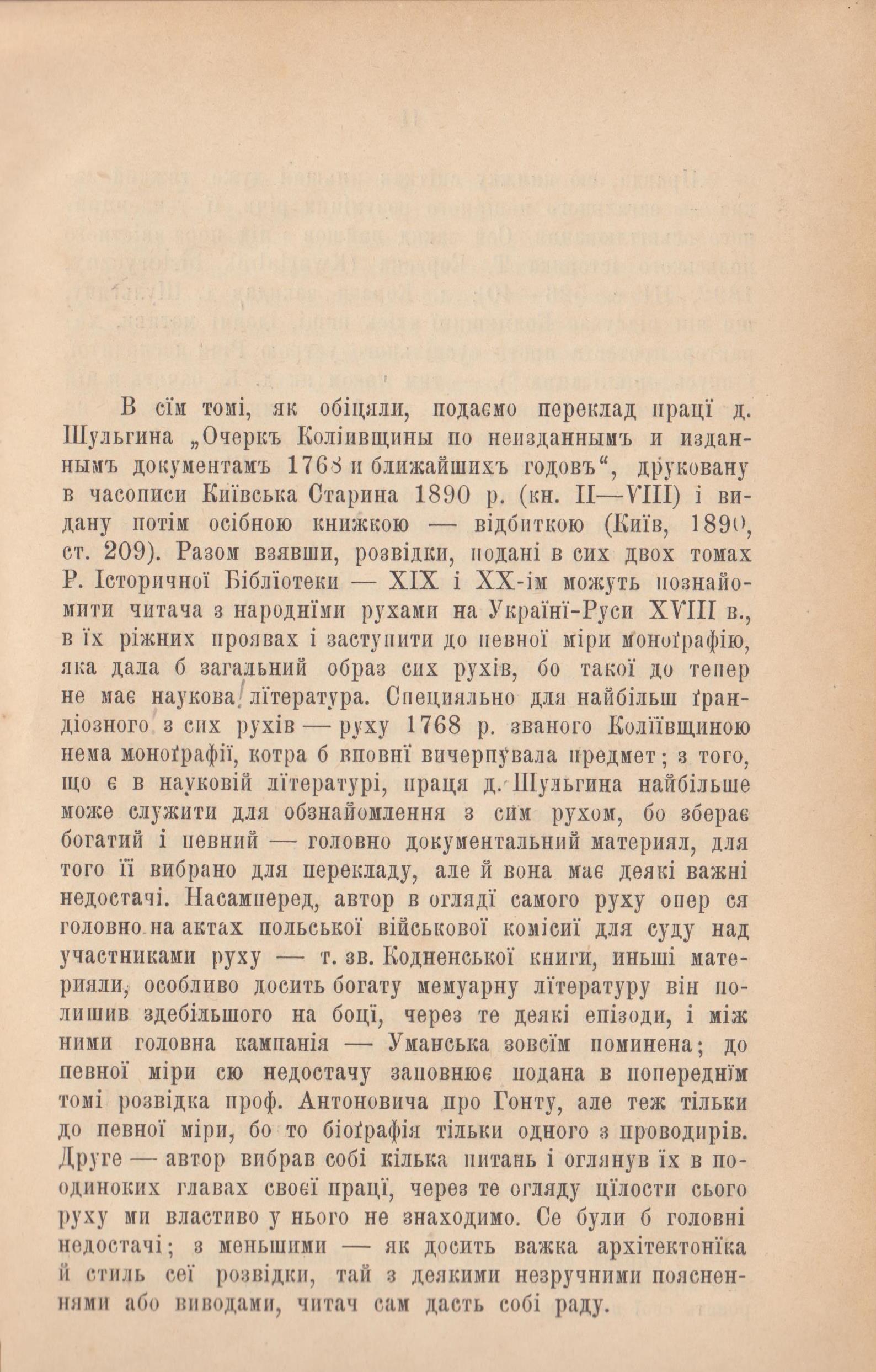 Я. Шульгин розглянув деякі аспекти козацько-селянського визвольного повстання y Правобережній Україні в 1768-1769 рр., яке отримало назву «Коліївщина». Повстанський рух був спровокований нещадним гнітом православних українців в Речі Посполитій. У своєму дослідженні автор спирався на акти польської військової комісії для суду над учасниками руху, зокрема, на «Книгу воєнно-судової кодненської комісії»; подав важливі біографічні відомості про чотирьох визначних ватажків руху, і насамперед про Максима Залізняка. У передмові до публікації М. С. Грушевський наголосив на цінності цієї праці, водночас відмітивши, що автор відібрав лише кілька питань, і оглянув їх в поодиноких главах своєї праці, через те цілості опису народного руху немає. «Головна кампанія – Уманська – зовсім поминена», – писав М. С. Грушевський.