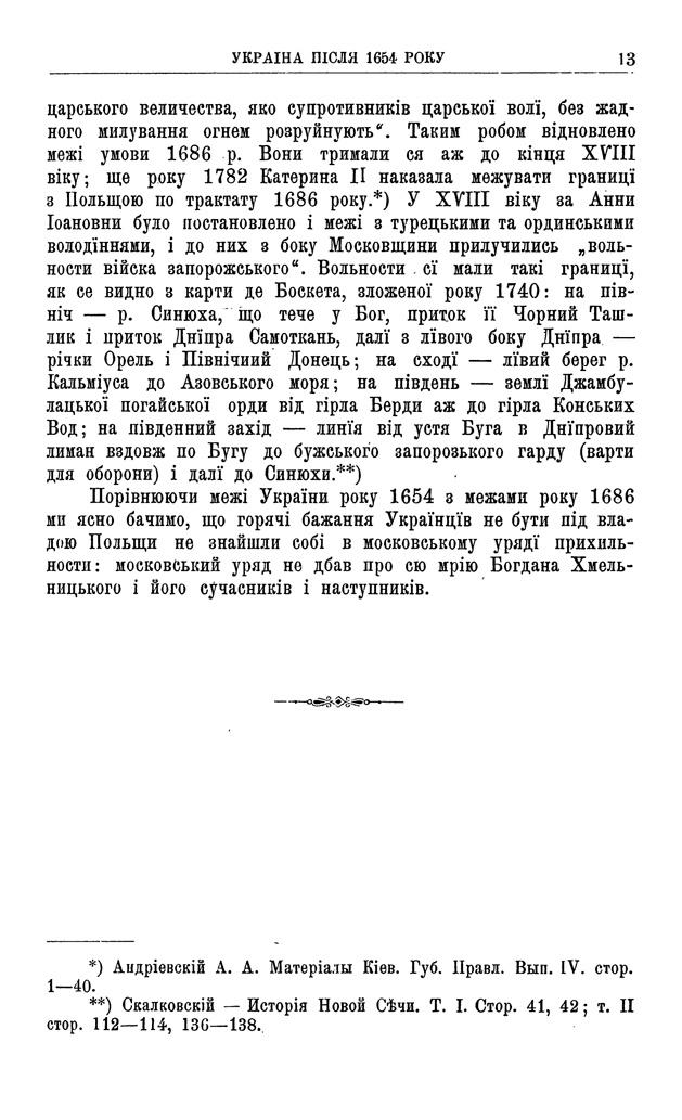 «Порівнюючи межі України року 1654 з межами року 1686, ми ясно бачимо, що гарячі бажання Українців не бути під владою Польщі не знайшли собі в московському уряді прихильності: московський уряд не дбав про сю мрію Богдана Хмельницького і його сучасників і наступників».