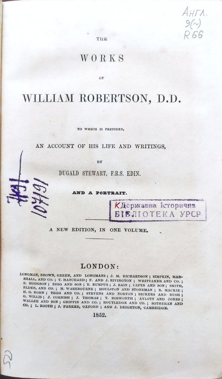 Вільям Робертсон (англ. William Robertson, 1721–1793) — шотландський історик, церковний діяч та один з найвизначніших представників Шотландського Просвітництва. У фонді бібліотеки зберігаються його історичні праці, що відіграли важливу роль у формуванні європейського бачення позаєвропейських культур, зокрема Індії, у XVIII столітті.