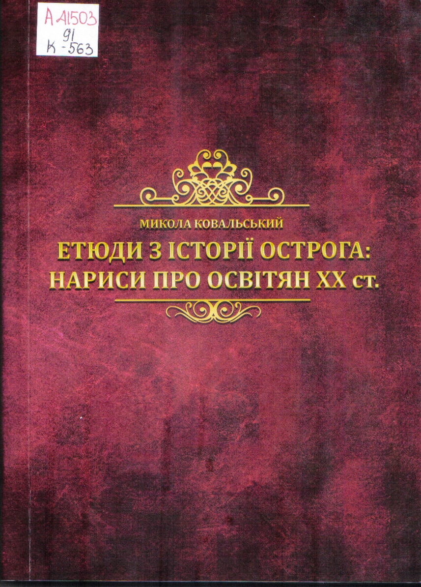 А41503 91 У книзі вміщено нариси відомого українського історика доктора історичних наук, професора Миколи Павловича Ковальського (1929-2006) про острозьких освітян ХХ ст., уперше надруковані впродовж 1900-2004 рр. у регіональній пресі (переважно Острог, Дубно та Шепетівка). |