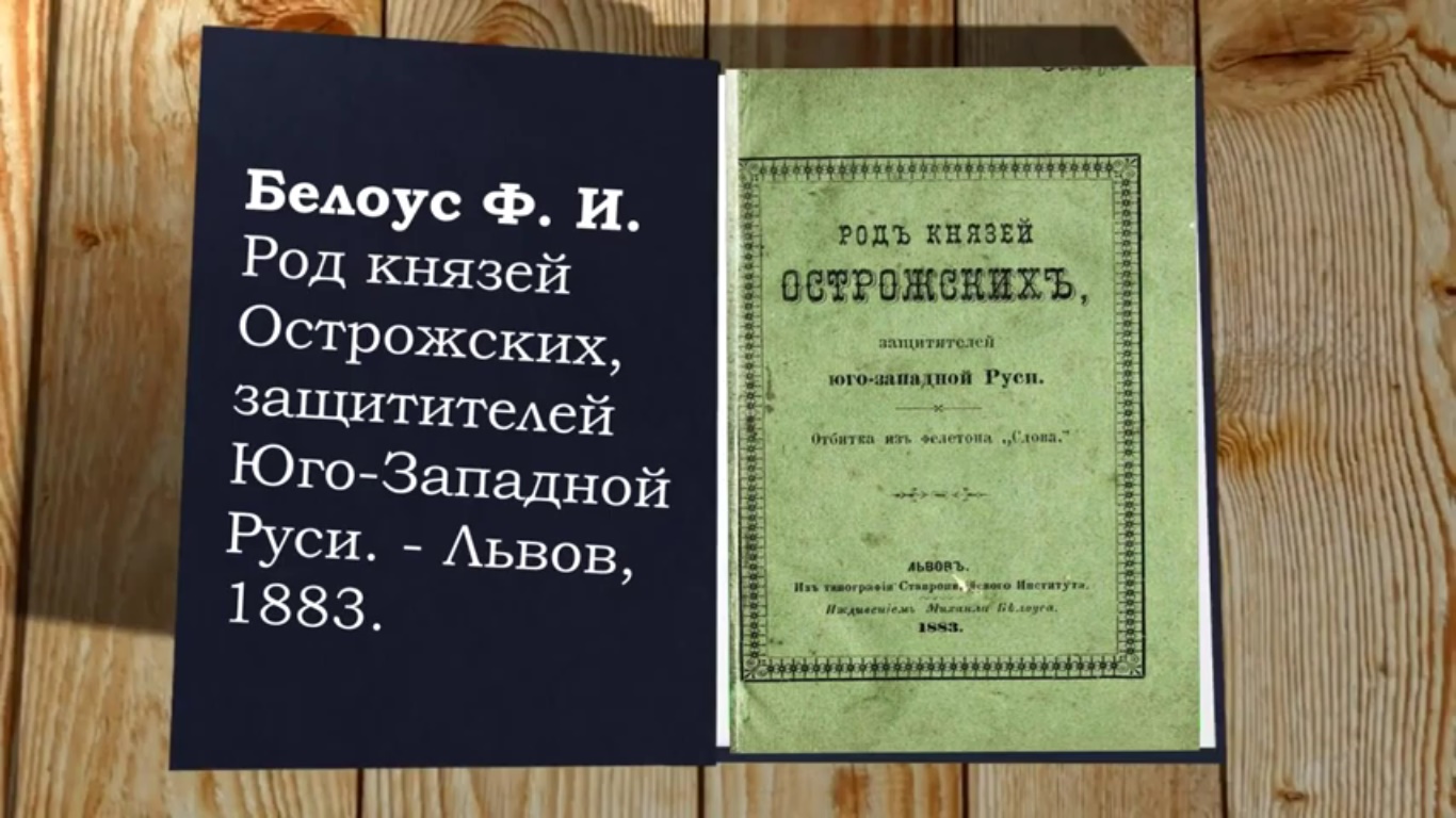 Буктрейлер до монографії Білоуса Теодора (Федора) Івановича «Рід князів Острозьких, захисників Південно-Західної Русі» (1883) → https://youtu.be/D6xnmBAqaVI |