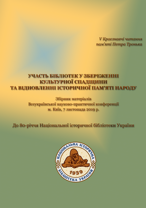 Оприлюднено електронну версію збірника матеріалів Всеукраїнської науково-практичної конференції "Участь бібліотек у збереженні культурної спадщини та відновленні історичної пам’яті народу", яка відбулася у Національній історичній бібліотеці України 7 листопада 2019 р.