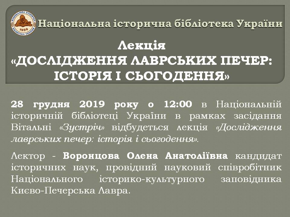 28 грудня 2019 року о 12:00 в Національній історичній бібліотеці України в рамках засідання Вітальні «Зустріч» відбудеться лекція «Дослідження лаврських печер: історія і сьогодення».
