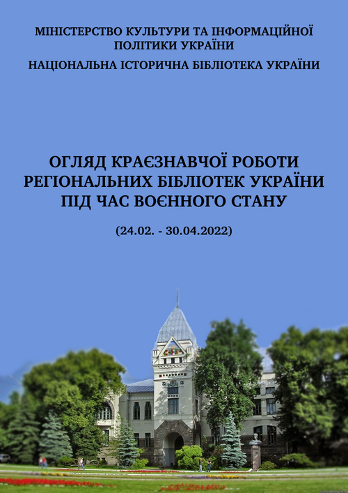 Огляд краєзнавчої роботи регіональних бібліотек України під час воєнного стану (24.02 - 30.04.2022) / Національна історична бібліотека України ; підгот. О. Покропивна ; ред.: О. Михайлова, Н. Волошінська. - Київ, 2022. - [11] с.