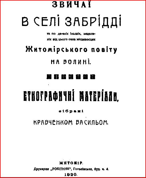 Кравченко, Василь Григорович. Звичаї в селі Забрідді та по деяких інших, недалеких від цього села місцевостях Житомирського повіту на Волині : етнографічні матеріали зібрані Кравченком Васильом / В. Г. Кравченко. – Житомир : Робітник, 1920. – 244 с.