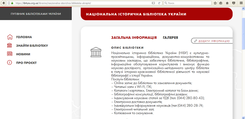 А ви вже знайшли нас? Національна історична бібліотека України Українська бібліотечна асоціація 27 січня офіційно запустила бібліотечний онлайн-сервіс "Путівник бібліотеками України", що наразі вміщує найбільшу базу бібліотек України - понад 16 000 бібліотек. Для чого цей сервіс: онлайн-сервіс Library for you / Бібліотека для тебе (веб та мобільна версія) орієнтує щодо бібліотек у всіх населених пунктах України та надає інформацію про бібліотечні послуги. Це дозволить кожному мешканцю України та її гостю обрати бібліотеку відповідно до його потреб. |