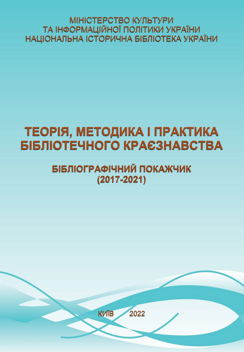 Теорія, методика і практика бібліотечного краєзнавства (2017-2021) : бібліогр. покажч. / Нац. іст. б-ка України ; підгот.: В. Кисельова ; ред. О. Михайлова ; відп. за випуск А. Скорохватова – Київ, 2022. – 173 с.
