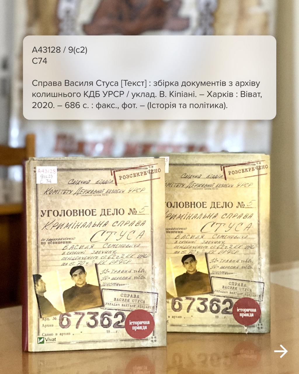 У фонді Бібліотеки зберігається видання «Справа Василя Стуса. Збірка документів з архіву колишнього КДБ УРСР» (укладач Вахтанг Кіпіані). У книжці зібрано документи з шеститомної кримінальної справи, яка зберігається на полицях Галузевого державного архіву СБУ. Вміщено архівні документи зі справи Василя Стуса (протоколи обшуків, допитів, листи, статті і т. д.), фотографії, статті Вахтанга Кіпіані, а також відомих дисидентів — Василя Овсієнка, Леоніда Бородіна. Додано останні прижиттєві нотатки Стуса — «З таборового зошита», таємно передані з табору на волю.